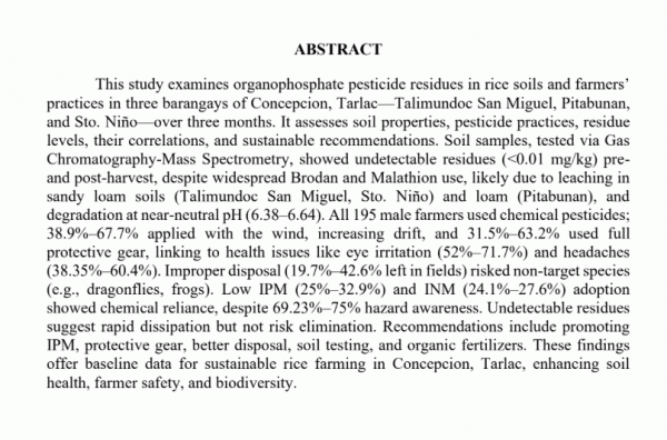 Assessment of organophosphate pesticide residue in rice soil and farmers' practices: towards sustainable rice farming in conception, tarlac/ Hermonio V. Flores III, Erico S. Ladra, Christopher John O. Lalis, and John Joshua P. Mandal.--