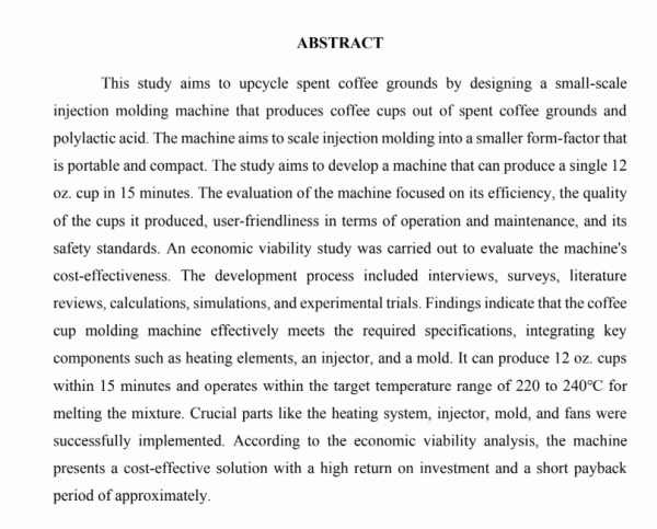 Design and development of a coffee cup molding machine using spent coffee grounds (scg)/ Jerelee De Castro, Eivan Adrian C. Gillera, Lowell Gae G. Gonzaga, Louie B. Ronato, and Jonas G. Sambat.--