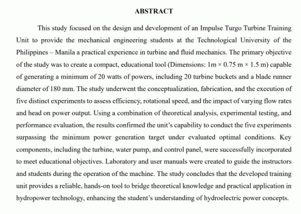 Design and development of an impulse turgo turbine training unit for mechanical engineering students of the technological university of the Philippines-manila/ Iverson G. Bautista, Luis Angelo P. Geron, Arvin Jerish T. Ong, Glen Paul B. Poblete, and Symone G. Tandog.--