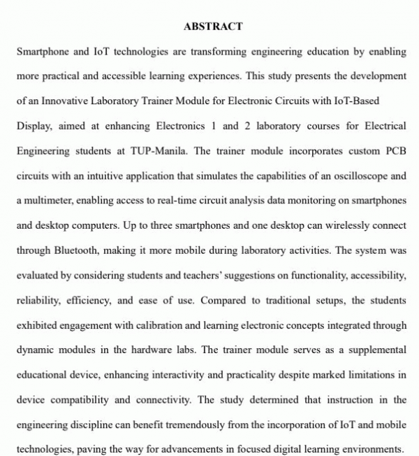 Innovative laboratory trainer module for electronic circuits with iot-based display/ Elesiah Faith C. Almendral, Catherine C. Ladignon, Fitz Gerald N. Ortega, Mark Aeron B. Pedroche, VIctor Emanuel E. Reyes, and Margaux Lois S. Valenzuela.--