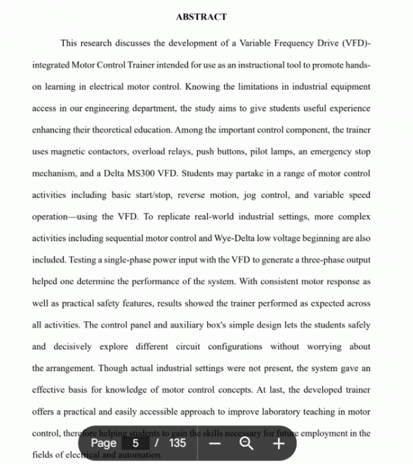 Development of motor control trainer integrated with variable frequency drive/ Daniel Luis M. Briones, Mike Gabriel R. Burgos, Johann Jedreck G. Escober, Patricia Shane V. Labandero, and John Patrick V. Sedantes.--
