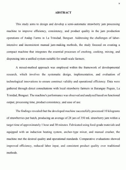 Design and development of a semi-automatic strawberry jam processing machine for local farmers at la trinidad, benguet/ Kenneth B. Dela Peña, Bryll Cristian Jyrmyn R. Hernando, Geraldine D. Reyes, Daryll L. Salvador, and Richard Lindion S. Tingcang.--