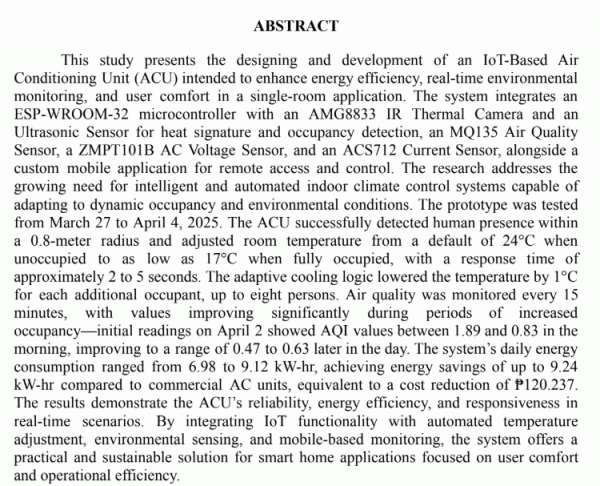 Iot-based air conditioning unit integrated with air purification, heat signature detection, and monitoring system/ Rikki Montero C. Bravo, Ranelyn Grace S. Cabral, Angelo O. Castilla, Neil Xyrone S. Dilidili, and Tristan Ivan M. Rodriguez.--