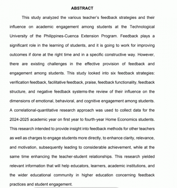 Teacher's feedback strategies and student's level of academic engagement at technological university of the philippines-cuenca extension program/ Grace M. Abris, Reachelle R. Aranda, and Jessa Joy D. Desuasido.--