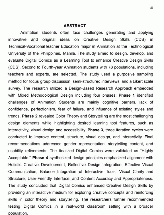 Dissertation note: College Of Industrial Education.-- Bachelor of technical vocational teacher education major in animation: Technological University of the Philippines, 2025. Summary: Animation students often face challenges generating and applying innovative and original ideas on Creative Design Skills (CDS) in Technical-VocationalTeacher Education major in Animation at the Technological University of the Philippines, Manila. The study aimed to design, develop, and evaluate Digital Comics as a Learning Tool to enhance Creative Design Skills (CDS). Second to Fourth-year Animation students with 78 populations, including teachers and experts, are selected. The study used a purposive sampling method for focus group discussion, semi-structured interviews, and a Likert scale survey. The research utilized a Design-Based Research Approach embedded with Mixed Methodological Design including four phases: Phase 1 identified challenges of Animation Students are mainly cognitive barriers, lack of confidence, perfectionism, fear of failure, and influence of existing styles and trends. Phase 2 revealed Color Theory and Storytelling are the most challenging design elements while highlighting desired learning tool features, such as interactivity, visual design and accessibility. Phase 3, three iteration cycles were conducted to improve content, structure, visual design, and interactivity. Final recommendations addressed gender representation, storytelling content, and usability refinements. The finalized Digital Comics were validated as “HIghly Acceptable.” Phase 4 synthesized design principles emphasized alignment with Holistic Creative Development, Reflective Design Integration, Effective Visual Communication, Balance Integration of Interactive Tools, Visual Clarity and Structure, User-Friendly Interface, and Content Accuracy and Appropriateness. The study concluded that Digital Comics enhanced Creative Design Skills by providing an interactive medium for exploring creative concepts and reinforcing skills in color theory and storytelling. The researchers further recommended testing Digital Comics