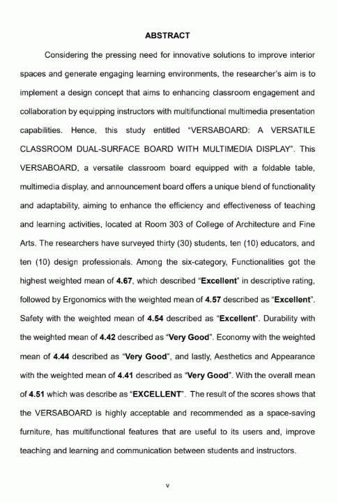 Versaboard: a versatile classroom dual-surface board with multimedia display/ Angel Belle G. Benitez, Ma. Leonor J. Dimaano, Alyssa Anna Veronica D. Hilario, Hazel Joice G. Jose, Judith Grace E. Magtangob, Jonaliza C. Peña, and Keilyn S. Resurreccion.--