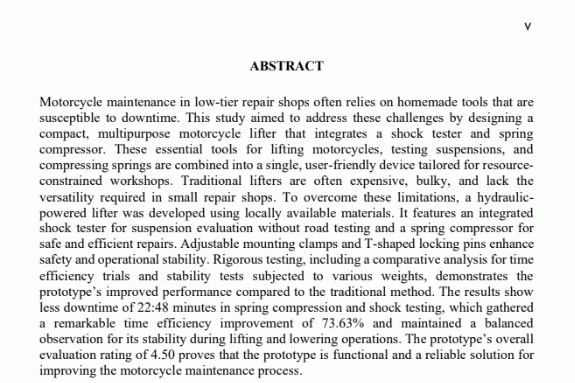 Development of multifunctional motorcycle lifter with shock tester and spring compressor/ Angelo Henry P. Abellar, Daniel Joseph M. Barluado, Kim Laurence C. Del Agua, Russel Keirt G. Magnaye, and Aivhan John M. Quilondrino.--