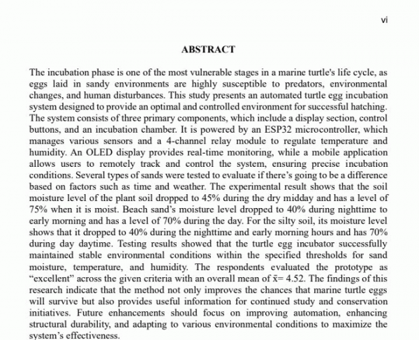 Development of an iot-based integrated incubation system for marine turtle eggs/ Jhon Michael B. Alsado, Camille A. Cabusora, Aliah P. Dela Cruz, Kimberly Mae N. Prudencio, and Jahnn Patrick F. Yanga.--