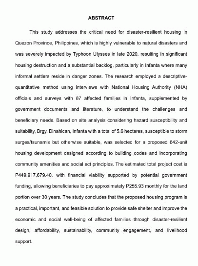 Dissertation note: Bachelor's thesis Bachelor of science in architecture: Technological University of the Philippines, 2025. Summary: This study addresses the critical need for disaster-resilient housing in Quezon Province, Philippines, which is highly vulnerable to natural disasters and was severely impacted by Typhoon Ulysses in late 2020, resulting in significant housing destruction and a substantial backlog, particularly in Infanta where many informal settlers reside in danger zones. The research employed a descriptive- quantitative method using interviews with National Housing Authority (NHA) officials and surveys with 87 affected families in Infanta, supplemented by government documents and literature, to understand the challenges and beneficiary needs. Based on site analysis considering hazard susceptibility and suitability, Brgy. Dinahican, Infanta with a total of 5.6 hectares, susceptible to storm surges/tsunamis but otherwise suitable, was selected for a proposed 642-unit housing development designed according to building codes and incorporating community amenities and social act principles. The estimated total project cost is P449,917,679.40, with financial viability supported by potential government funding, allowing beneficiaries to pay approximately P255.93 monthly for the land portion over 30 years. The study concludes that the proposed housing program is a practical, important, and feasible solution to provide safe shelter and improve the economic and social well-being of affected families through disaster-resilient design, affordability, sustainability, community engagement, and livelihood support.