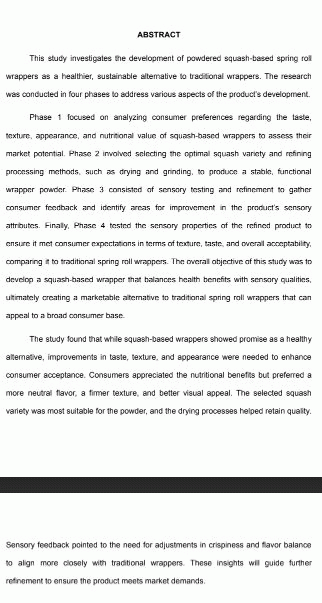 Development and acceptance of powdered squash-based spring roll wrapper/ Jeff Dionwell Caduco, Laizy Ann Martinez, Jhane Lie Matias, and Jeremae Valencia.--